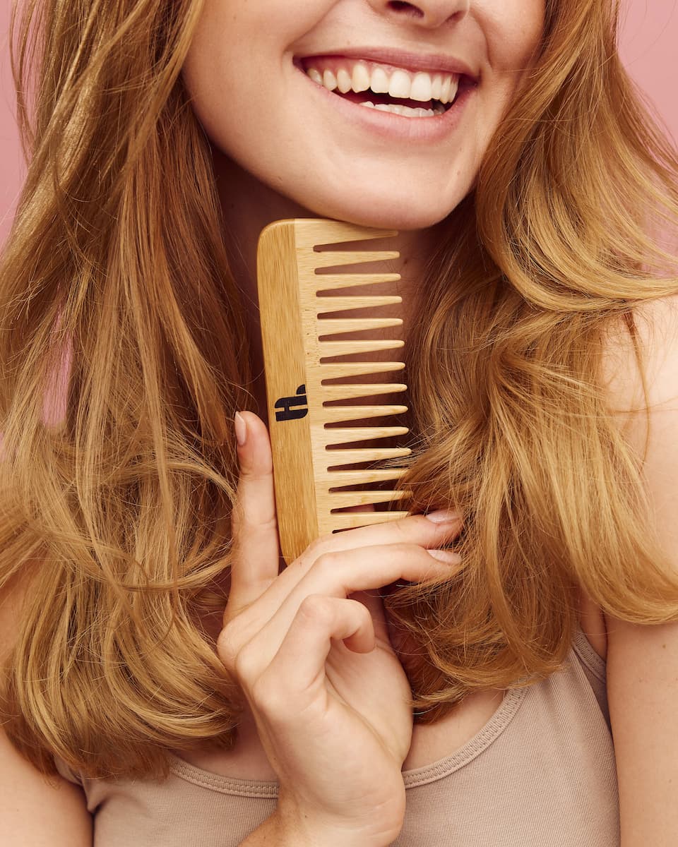 Een grove kam van bamboe om droog of nat haar voorzichtig en moeiteloos te ontwarren.