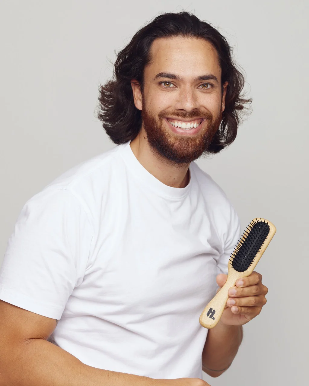 Verwijder bij het reinigen van de styling brush eerst de haren van de borstelharen en gooi ze in de vuilnisbak. Was de borstel vervolgens met water en laat hem aan de lucht drogen met de borstelharen naar beneden. Alle bamboe haarborstels hebben een klein gaatje in de borstelkop. Dit gaatje zorgt ervoor dat vocht uit de styling brush kan ontsnappen en zich niet onder het borstelkussen verzamelt.