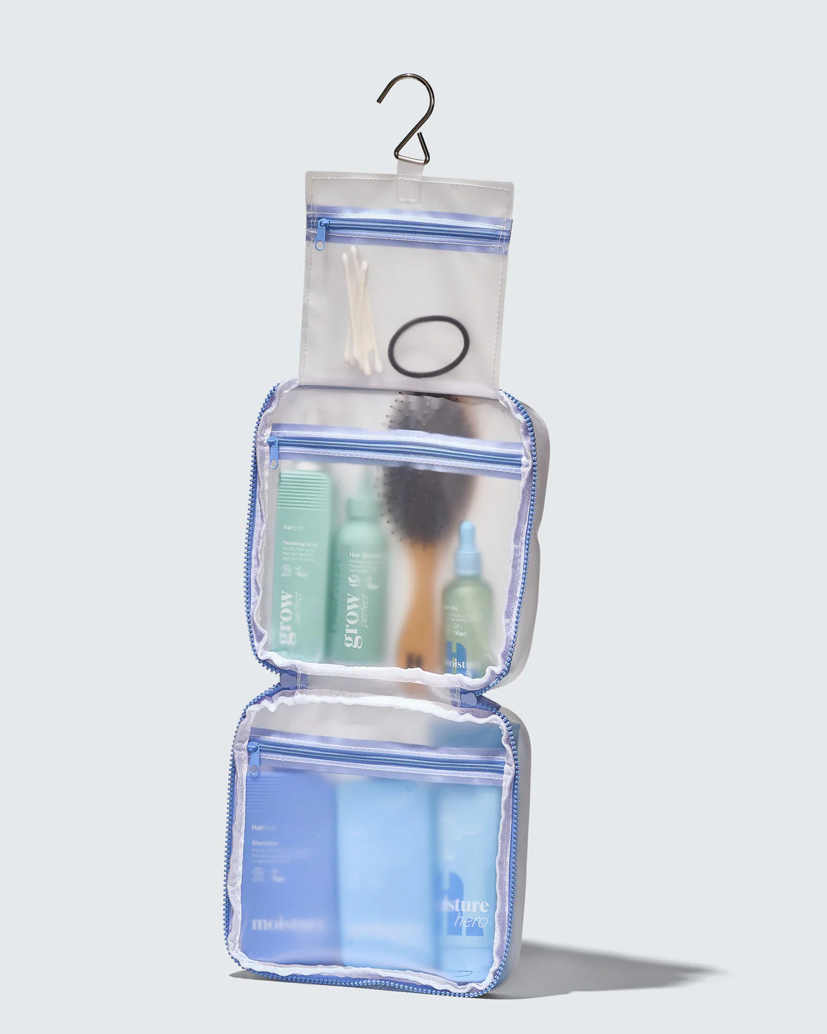 Deze reis toilettas is waterbestendig, gemakkelijk schoon te maken en lichtgewicht voor ultiem gebruiksgemak. De matte afwerking, gecombineerd met een trendy blurple-kleurige details en een stevige ritssluiting, voegt een moderne uitstraling toe. Het hangende, doorzichtige ontwerp stelt je in staat om al je haarverzorgingsproducten gemakkelijk te bereiken, terwijl je waardevolle ruimte in de badkamer bespaart. Hang het simpelweg op en alles wat je nodig hebt is binnen handbereik.